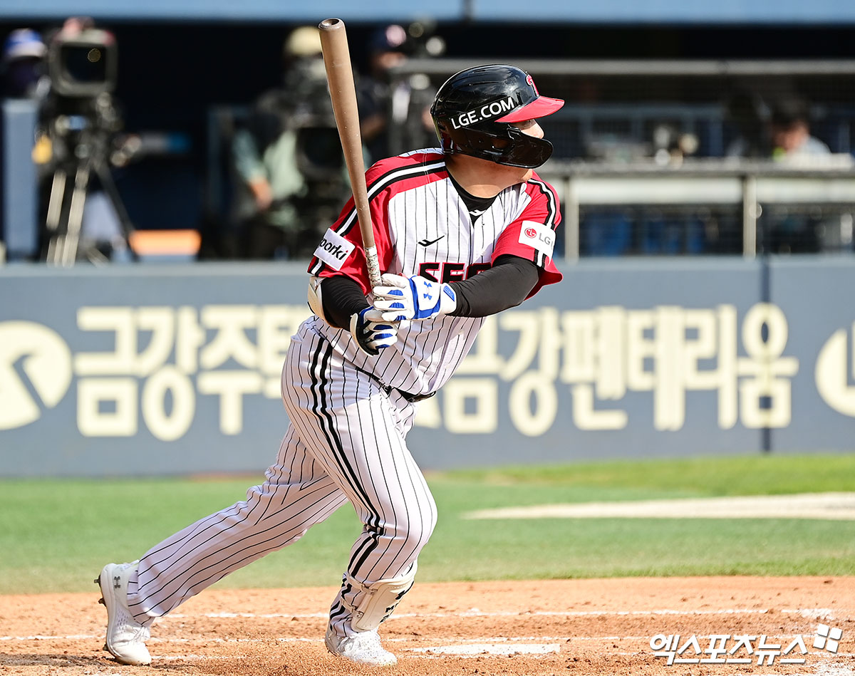 (엑스포츠뉴스 잠실, 김한준 기자) 15일 오후 서울 송파구 잠실야구장에서 열린 '2023 신한은행 SOL KBO리그' 두산 베어스와 LG 트윈스의 경기, 4회말 1사 LG 김현수가 좌전안타를 날리고 있다.