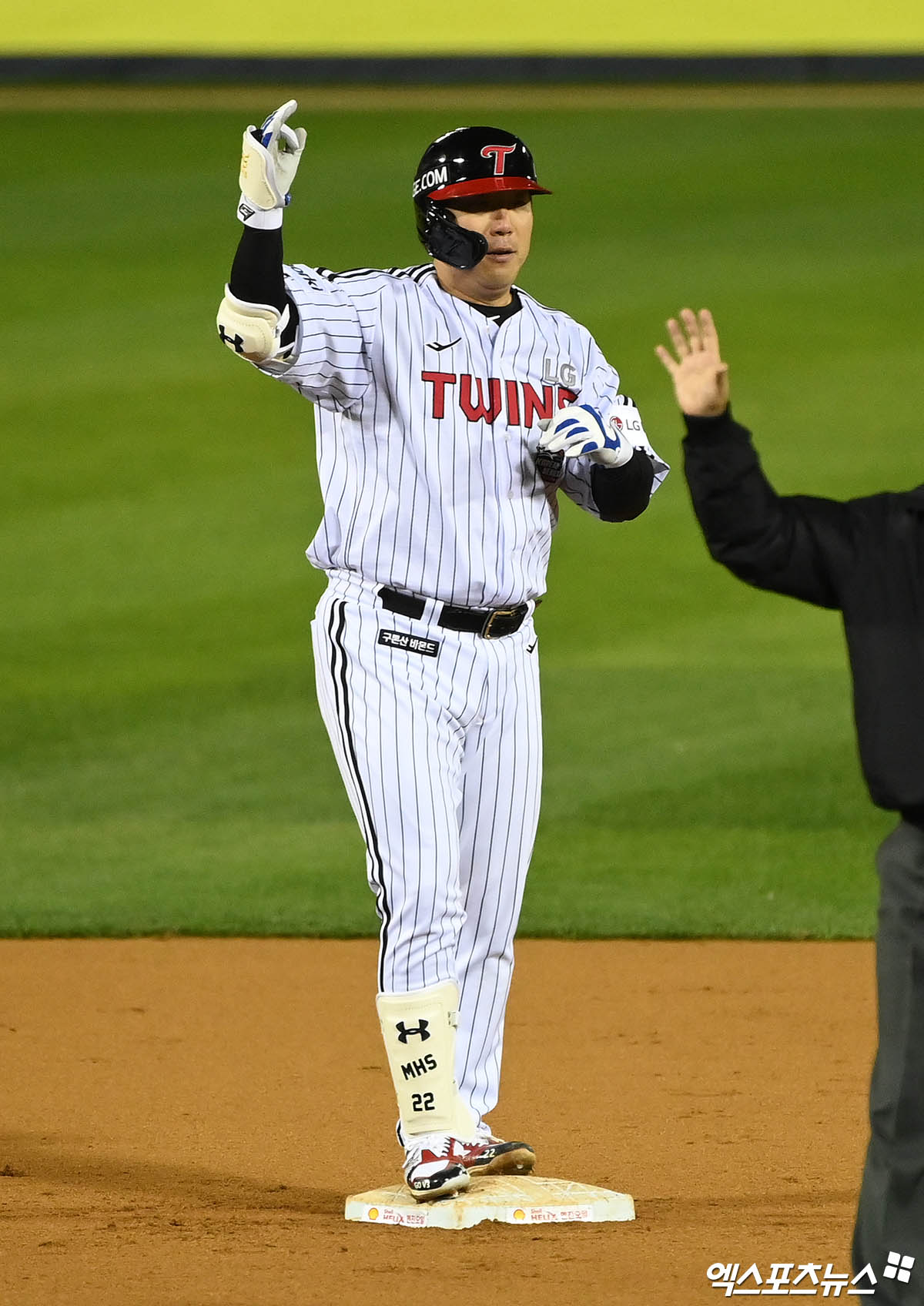 (엑스포츠뉴스 잠실, 박지영 기자) 8일 오후 서울 송파구 잠실야구장에서 열린 '2023 신한은행 SOL KBO 포스트시즌' KT 위즈와 LG 트윈스의 한국시리즈 2차전 경기, 7회말 2사 1루 LG 김현수가 1타점 적시 2루타를 때려낸 뒤 세리머니를 하고 있다.