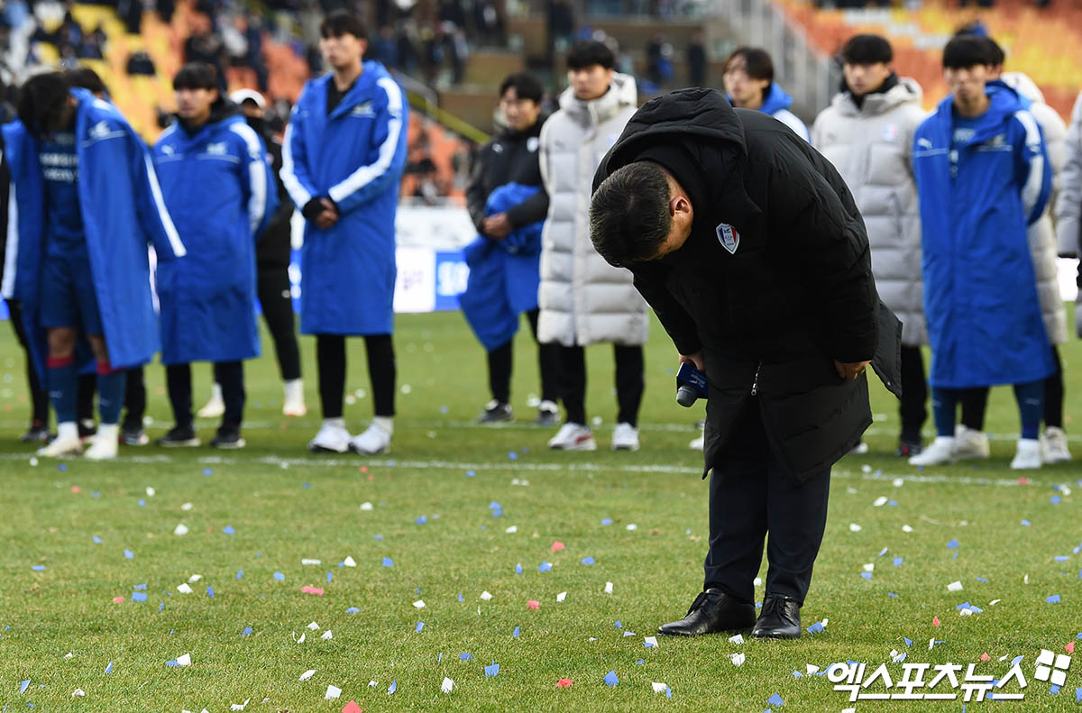 경기 종료 후 수원 삼성 오동석 단장이 관중석을 향해 허리 숙여 인사하고 있다.