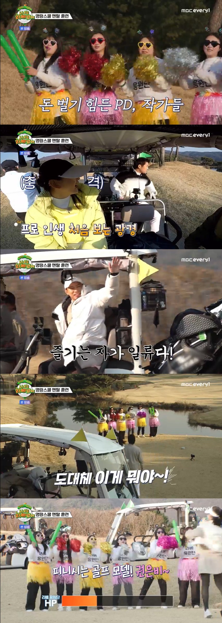 치어리더로 변신한 제작진은 "보여줘요 김국진. 도와줘요 문정현. 이번에는 보여줘 전현무. 잘생겼다 허경환. 골프 모델 권은비"라고 외치며 멤버들의 멘탈을 흔들기 시작했다.