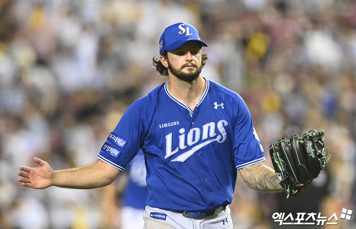 (엑스포츠뉴스 잠실, 박지영 기자) 30일 오후 서울 송파구 잠실야구장에서 열린 '2024 신한 SOL BanK KBO리그' 삼성 라이온즈와 LG 트윈스의 경기, 7회말 종료 후 삼성 선발투수 코너가 더그아웃으로 향하며 호투를 자축하고 있다.
