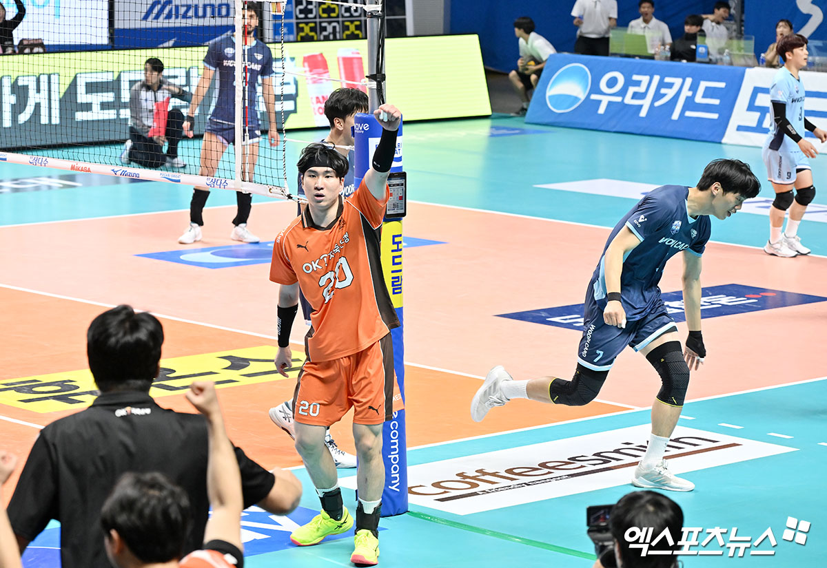 (엑스포츠뉴스 장충, 김한준 기자) 20일 오후 서울 장충체육관에서 열린 ‘도드람 2024-2025 V-리그’ 우리카드와 OK금융그룹의 경기, OK금융그룹가 우리카드에 세트스코어 3:1(25-23 20-25 25-20 25-23)로 승리하며 4연패에서 탈출했다.