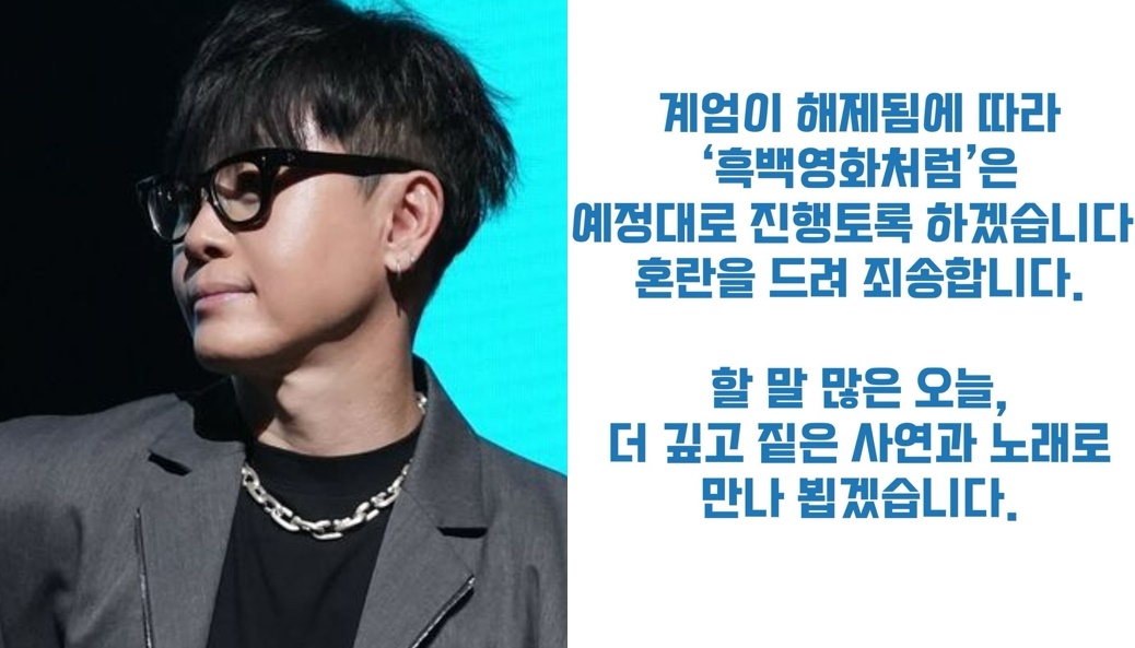 4일 오전 이승환은 비상계엄 여파로 취소했던 공연을 재개하겠다고 공지했다. 그는 "계엄이 해제됨에 따라 '흑백영화처럼'은 예정대로 진행토록 하겠습니다"라며 "할 말 많은 온르, 더 깊고 짙은 사연과 노래로 만나 뵙겠습니다"라고 밝혔다.