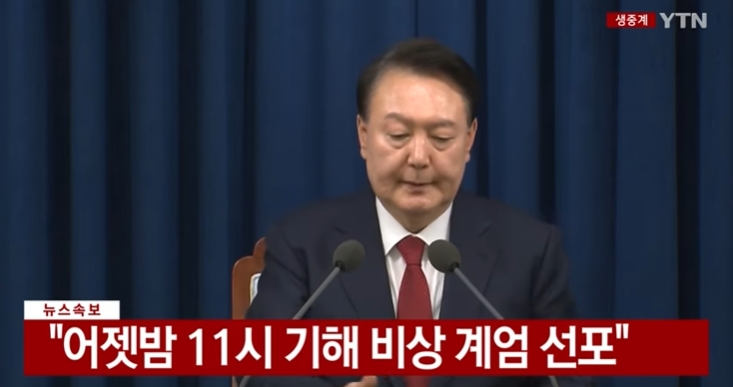 한편 윤석열 대통령은 3일 오후 10시 25분경 대통령실 긴급 담화에서 "비상계엄을 통해 망국의 나락으로 떨어지는 자유 대한민국을 재건하고 지켜낼 것"이라며 비상계엄을 선포했다.