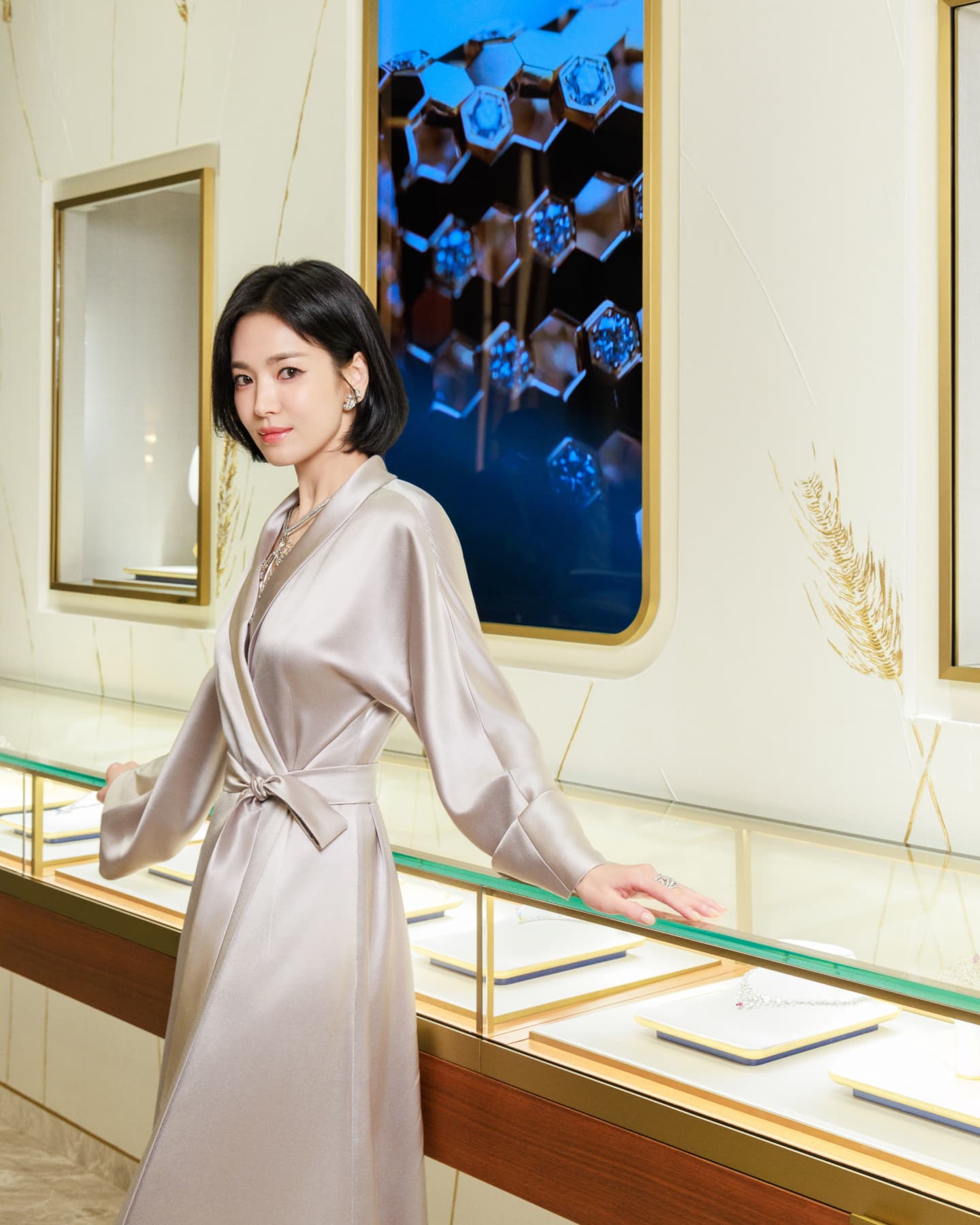 사진 속 송혜교는 실크 소재의 롱드레스를 입고 주얼리 앞에서 포즈를 취하고 있다.