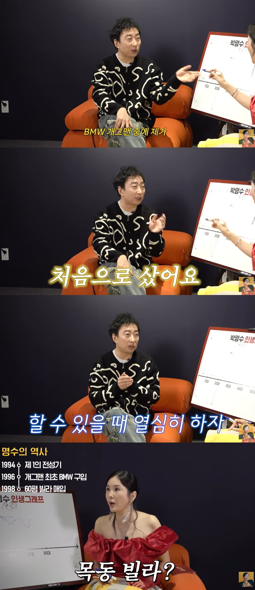 그러면서 박명수는 "개그맨 중에 BMW를 제가 처음으로 샀다. 우리나라에 그때 BMW 차도 없었다. 1996년인가에 나이트클럽 일 다니려고 BMW 3시리즈를 처음으로 사서 타고 다녔다"고 전했다.