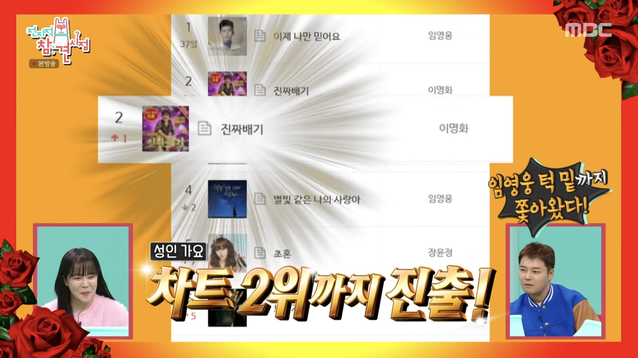 확인해보니 성인 가요 차트에서 5위 장윤정의 '초혼'을 제치고 무려 2위에 올랐던 것. 전현무는 "임영웅 턱밑까지 쫓아왔다"라며 감탄했다.