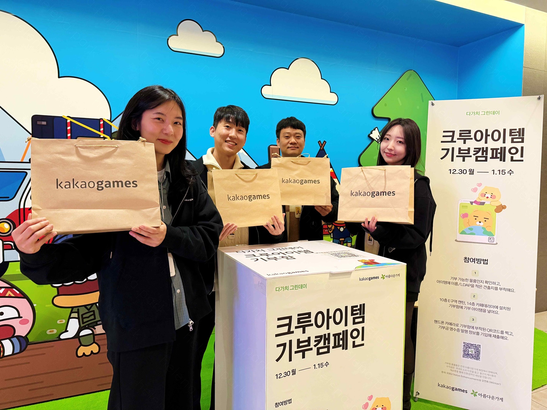 올해 캠페인은 2024년 12월 30일부터 2025년 1월 15일까지 카카오게임즈 사내 카페 라운지에서 열렸으며, 임직원들은 사내에 설치된 기부함에 활용 가능한 의류, 도서, 장난감 등 다양한 물품들을 기부했다. 모인 기부 물품은 비영리 공익 재단 ‘아름다운가게’를 통해 판매될 예정이며, 판매 수익금은 국내외 소외계층 이웃을 돕는 다양한 활동에 사용된다.