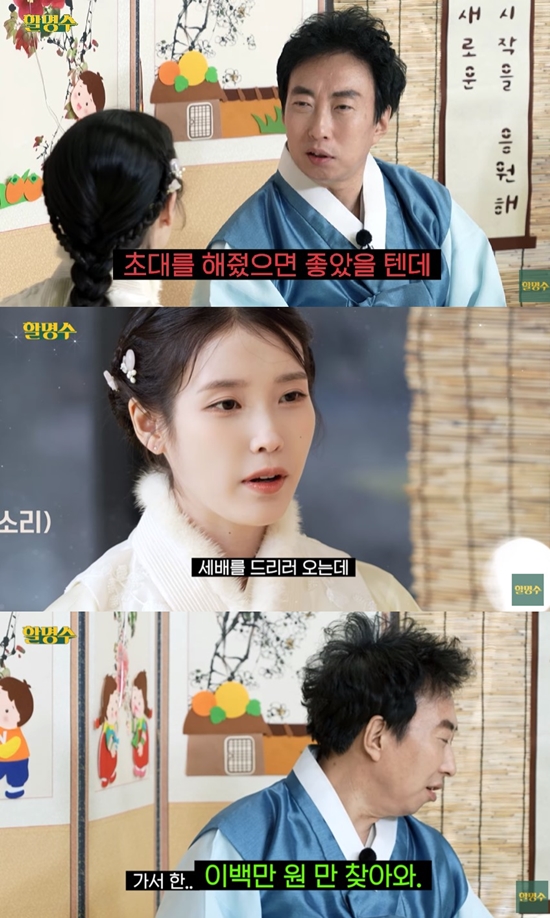 박명수는 아이유의 고운 한복 자태를 보곤 칭찬 세례를 퍼부었다. 아이유는 "세배를 드리러 오는데 (예쁘게 하고 와야죠)"라고 했고, 이를 듣던 박명수는 "가서 이백만 원만 찾아와라"라며 애정을 드러냈다.