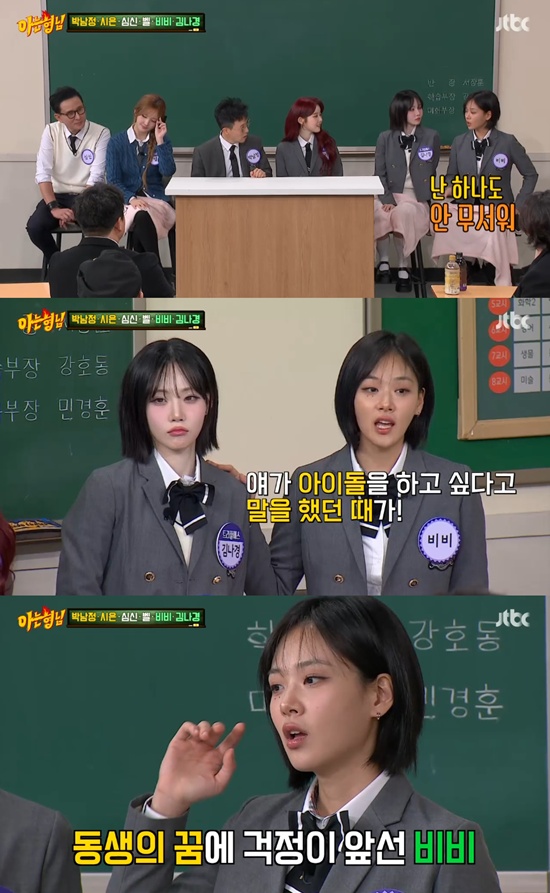 그는 동생이 걸그룹 한다고 했을 때 "걱정을 많이 했다"고. 옆에서 듣던 김나경은 "(비비가) 공부가 쉽다고 공부하라고 했다"고 했다. 비비는 "얘보다는 (공부) 잘했다. 둘 다 못했는데 얘보다는 잘했다"고 했고, 김나경은 "나는 노력을 안 했다"며 티격태격해 웃음을 자아냈다.