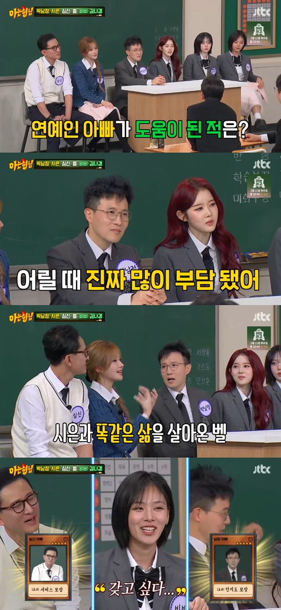 시은과 벨에게 연예인 아빠가 도움이 된 적이 있느냐고도 물었다. 시은은 "어릴 때 진짜 많이 부담됐다. 전교에 박남정 딸로 소문이 났다. 요즘도 그렇고 점점 좋아진다. 예능을 나가면 내가 호동이나 장훈이랑 초면인데 아빠에 대한 반가운 마음에 '진짜 팬이었다' 한 번 더 인사하게 되고 그런다"고 이야기했다.