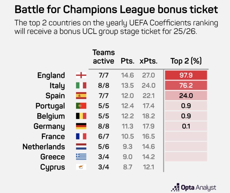 '옵타'는 "슈퍼컴퓨터로 시즌 예측을 해봤다. UEFA 계수 순위에서 각 협회에 대한 예상 포인트(xPts) 총계를 예상해볼 수 있다. 이 결과로 어떤 국가가 다음 시즌 UCL 추가 자리를 획득할 가능성이 높은지 알 수 있다"라고 설명했다.