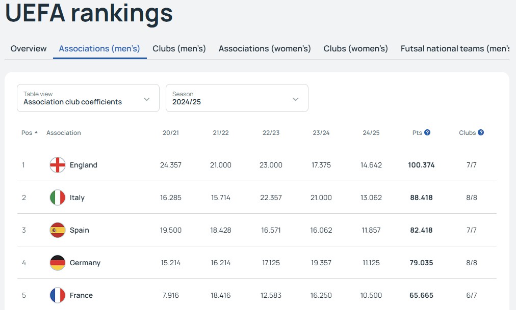UEFA는 매시즌 해당 협회가 주관하는 대회(챔피언스리그, 유로파리그, 컨퍼런스리그)에서 참가한 각 국가 소속 리그 팀들의 성적을 매긴다.