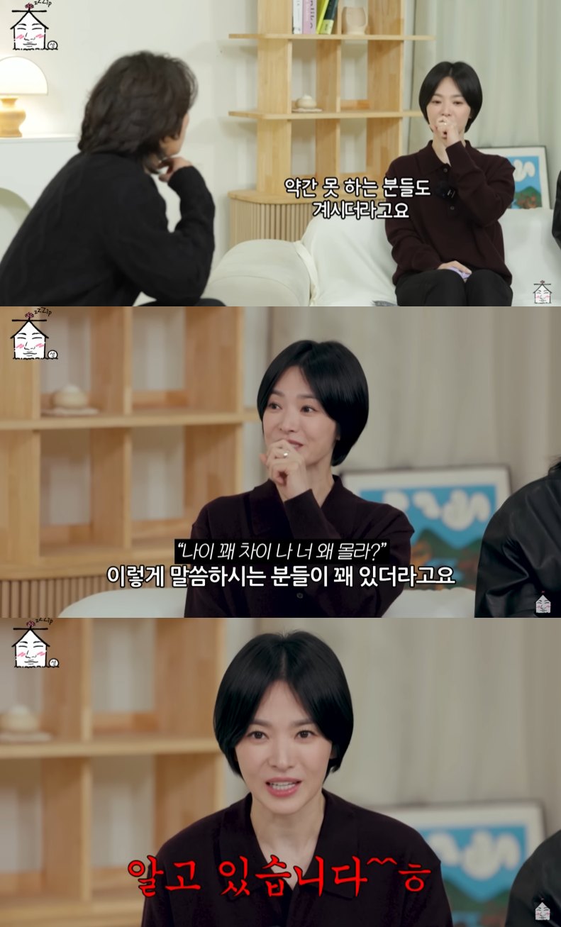 송혜교는 "약간 (유머를) 이해 못하시는 분들도 계시더라고요. 그래서 사람들이 '(전여빈과) 나이 꽤 차이나 너 왜 몰라'라고 말씀하시는 분들이 있더라고요. 알고 있습니다. 나이 차이 많이 납니다"라고 말하며 웃었다.