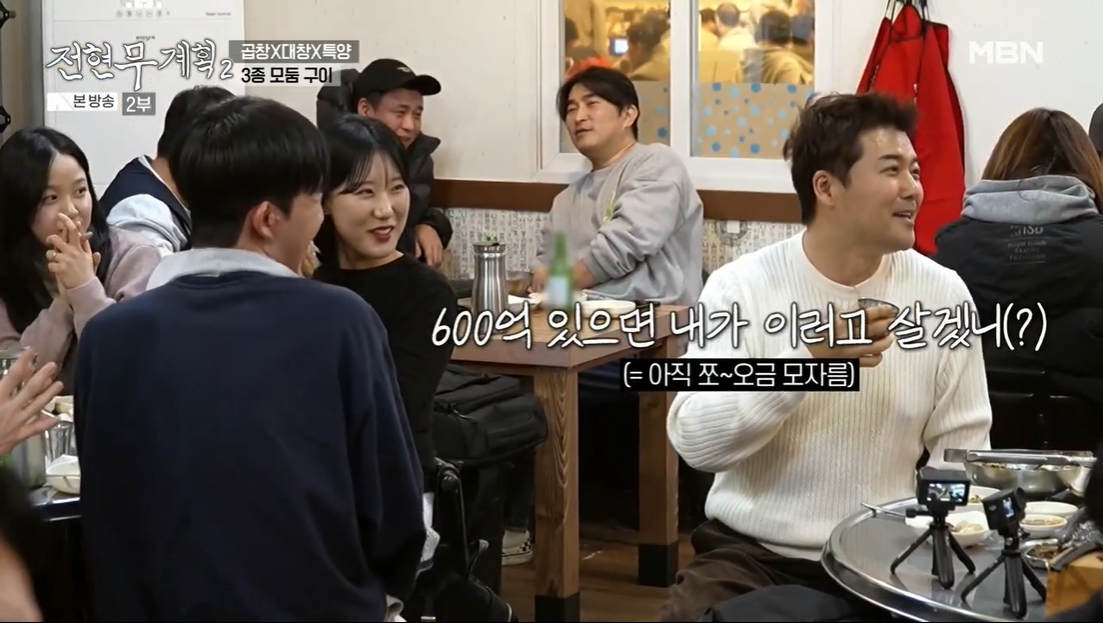 이들이 향한 곳은 바로 곱창집. 의외로 젊은 사람들이 많이 모여있는 이곳에서 곽튜브(본명 곽준빈)는 "이 방송하면서 저보다 어린 분들 진짜 오랜만에 본다. 노포만 찾아가다보니까"라고 놀라워했고, 전현무는 "나 여기 홍대인 줄 알았다"고 감탄했다.
