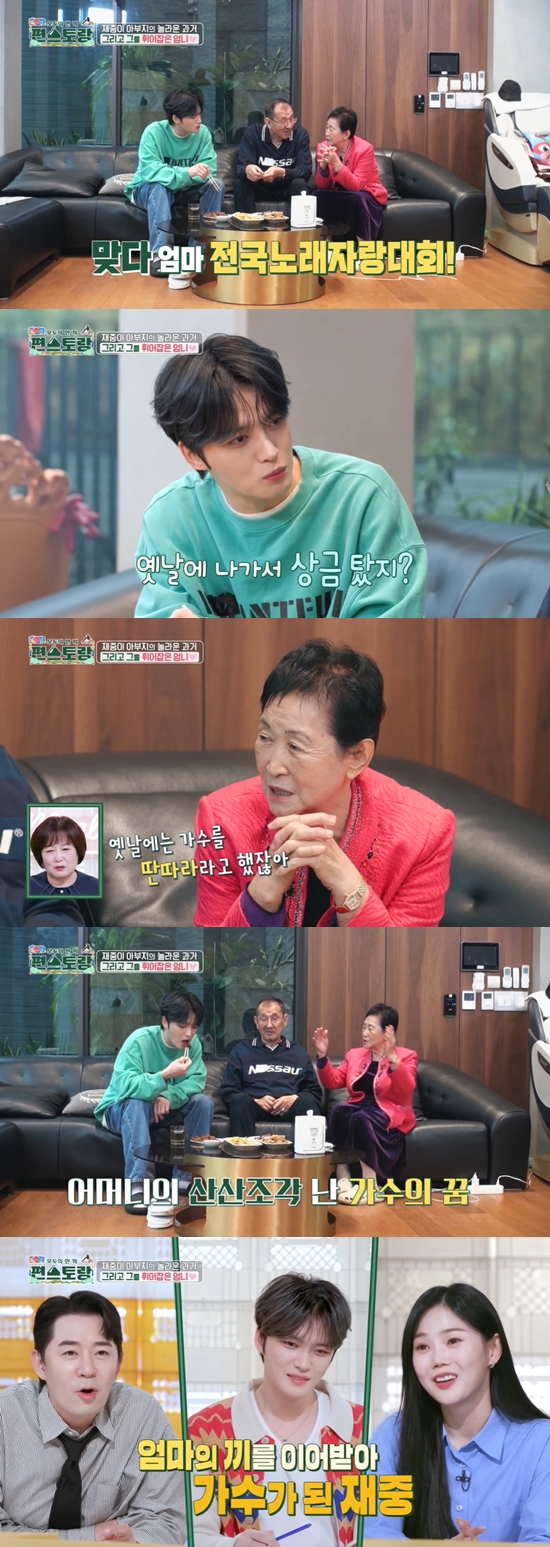 어머니는 "그 때 재중이 외할머니가 부지깽이 들고 쫓아왔다. 옛날에는 가수를 딴따라라고 했지 않나"라며 "그래서 엄마 꿈이 산산조각 났다. 엄마 꿈을 저버렸는데, 엄마 꿈을 재중이가 이뤄줬다"고 아들에게 고마움을 표했다.