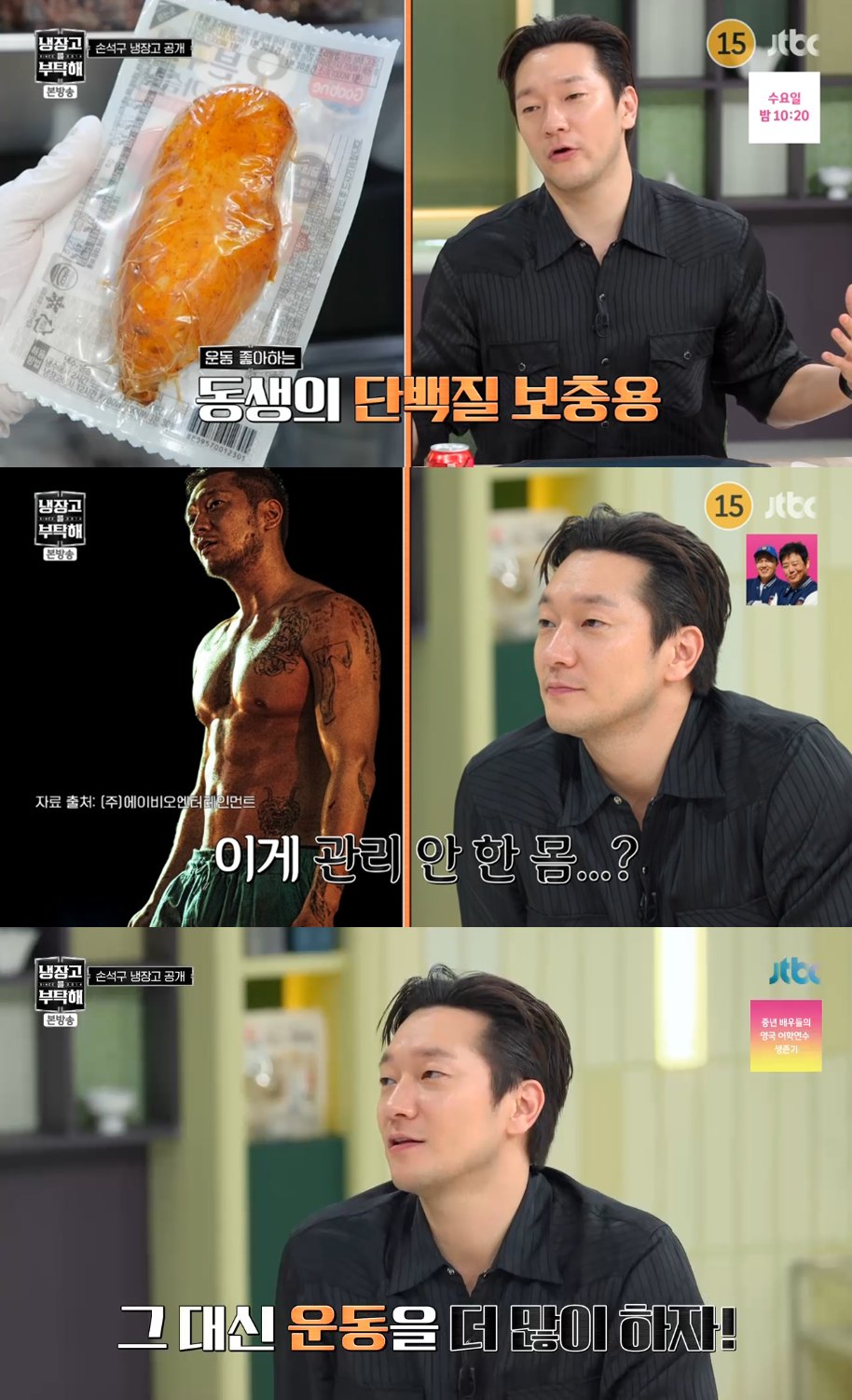 손석구의 냉장고에는 닭가슴살이 있었고, 그는 "동생이 운동을 해서 단백질 섭취를 위해 있다"고 말했다. 이에 김성주는 "식단관리 하시지 않냐"고 물었고, 손석구는 "식단관리는 못한다"면서 "저녁 9시까지 식단을 했다가 거기에 지고 새벽에 먹고 하니까. 먹고 싶은대로 먹고 대신 운동을 많이 한다"며 '범죄도시' 속 몸매 관리 비결을 알렸다.