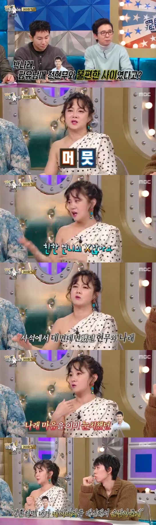 그리고 김국진은 박나래에게 "전현무와 한동안 불편한 사이었다고?"라면서 궁금해했고, 이에 박나래는 머뭇거리면서 "친한 언니의 전 남자친구이지 않냐"고 전현무와 교제했던 한혜진을 언급했다.