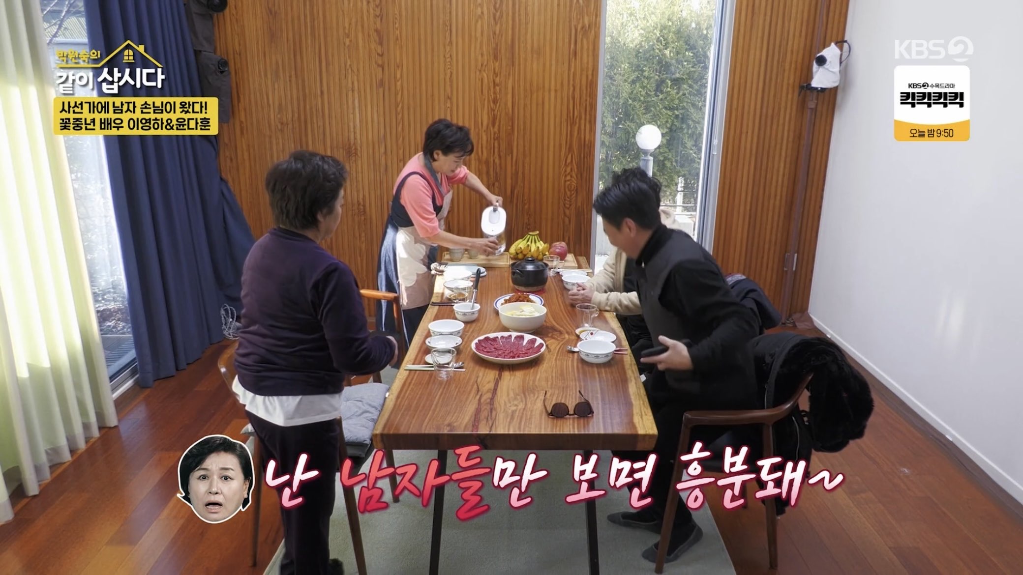 두 손님을 식탁으로 안내한 박원숙은 "남자들이 온 건 처음이다. 더군다나 이렇게 재밌는 사람들을. 난 남자들만 보면 흥분된다"라며 한껏 업된 모습으로 폭소를 안겼다.