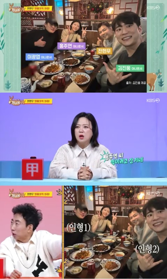 이날 엄지인은 "제보할 게 있다"면서 전현무가 이광엽, 김진웅, 홍주연 아나운서와 밖에서 따로 밥을 먹은 사실을 공개했다.