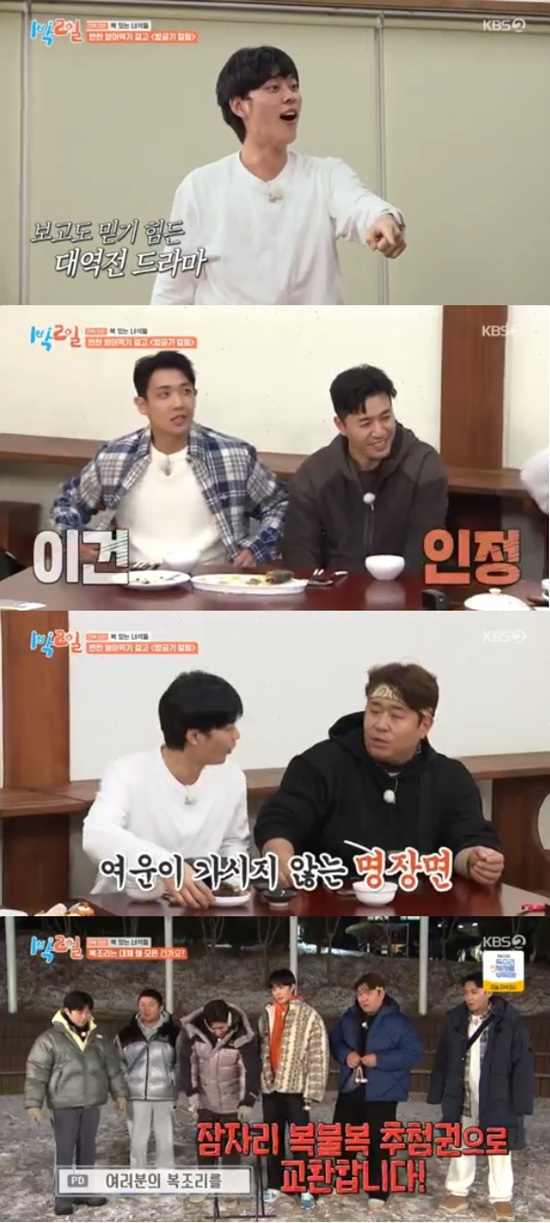 9일 방송된 KBS 2TV '1박 2일 시즌4'에서는 김종민, 문세윤, 조세호, 이준, 딘딘, 유선호의 전북 진안 여행기가 전파를 탔다.