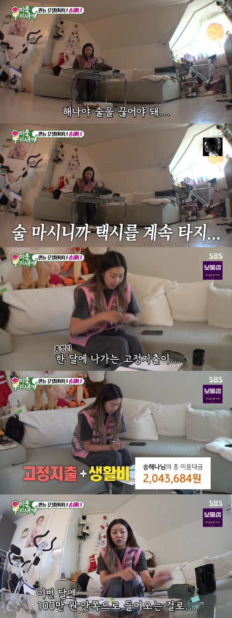 다음으로 술값을 정리하던 중, 한 날에 주류로만 18만 4천원을 쓴 내역을 발견한 송해나는 "술값 줄여야겠다"고 반성했다. 이어서 살펴본 택시비 내역에서는 한 달 택시비로 56,700원을 사용했다. 그는 "술을 끊어야 된다. 술 마시니까 택시를 계속 타는 거 아니냐"고 자조했다.