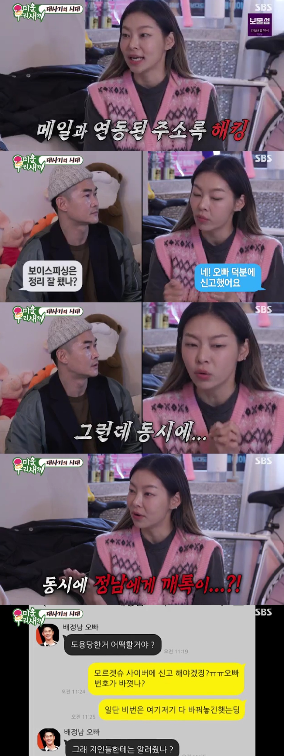 9일 방송된 SBS ‘미운 우리 새끼’에서는 송해나가 보이스피싱 피해를, 배정남은 사기 피해를 털어놓는 모습이 전파를 탔다.