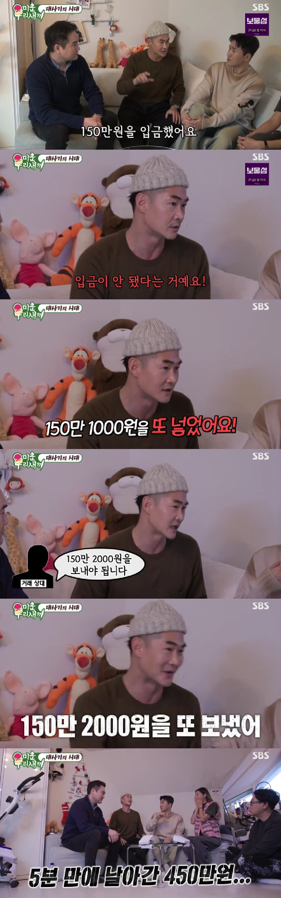 상대방이 안전 거래 링크를 페이지로 보낸 상황에서 배정남은 "150만 원을 입급했는데 입금이 안 됐다더라. 수수료 때문에 150만 1000원을 더해서 보내달라해서 바로 150만 1000원을 또 보냈다"며 "1000원만 보내는 건 안 된다더라"고 털어놓았다.