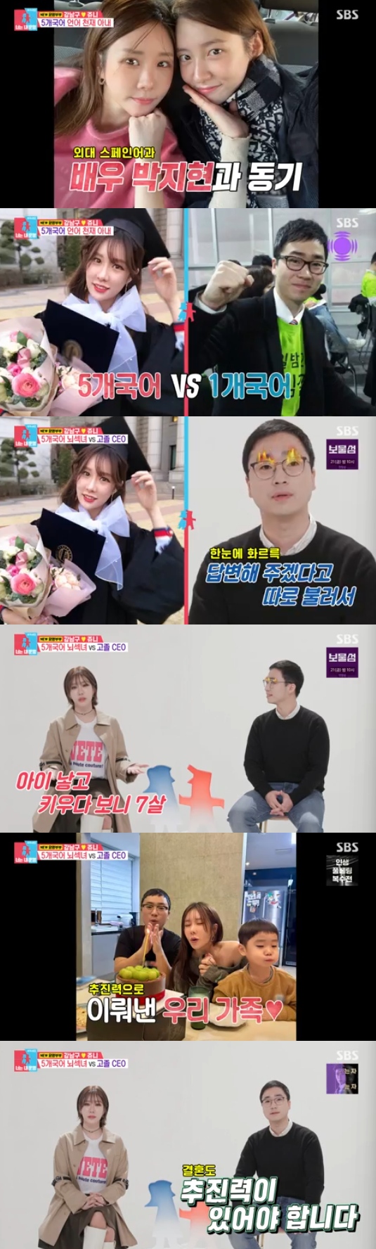 강남구와 쥬니의 투샷에 MC들은 "부부 그림체가 많이 다른 것 같다"면서 첫 만남에 대해 궁금해했다. 강남구는 "외대 축제 때 강의를 갔었다. 강의 때 질문하던 학생이 지금의 아내다. 너무 예뻤다. 그래서 끝나고 따로 불러서 밥을 먹자고 했다"면서 웃었다.