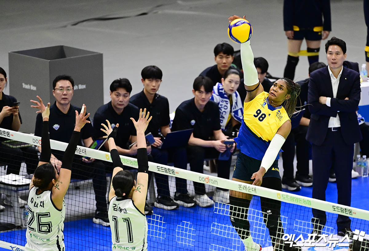 (엑스포츠뉴스 수원, 박지영 기자) 11일 오후 경기도 수원실내체육관에서 열린 '도드람 2024-2025 V리그' 현대건설과 한국도로공사의 경기, 현대건설 모마가 공격하고 있다.