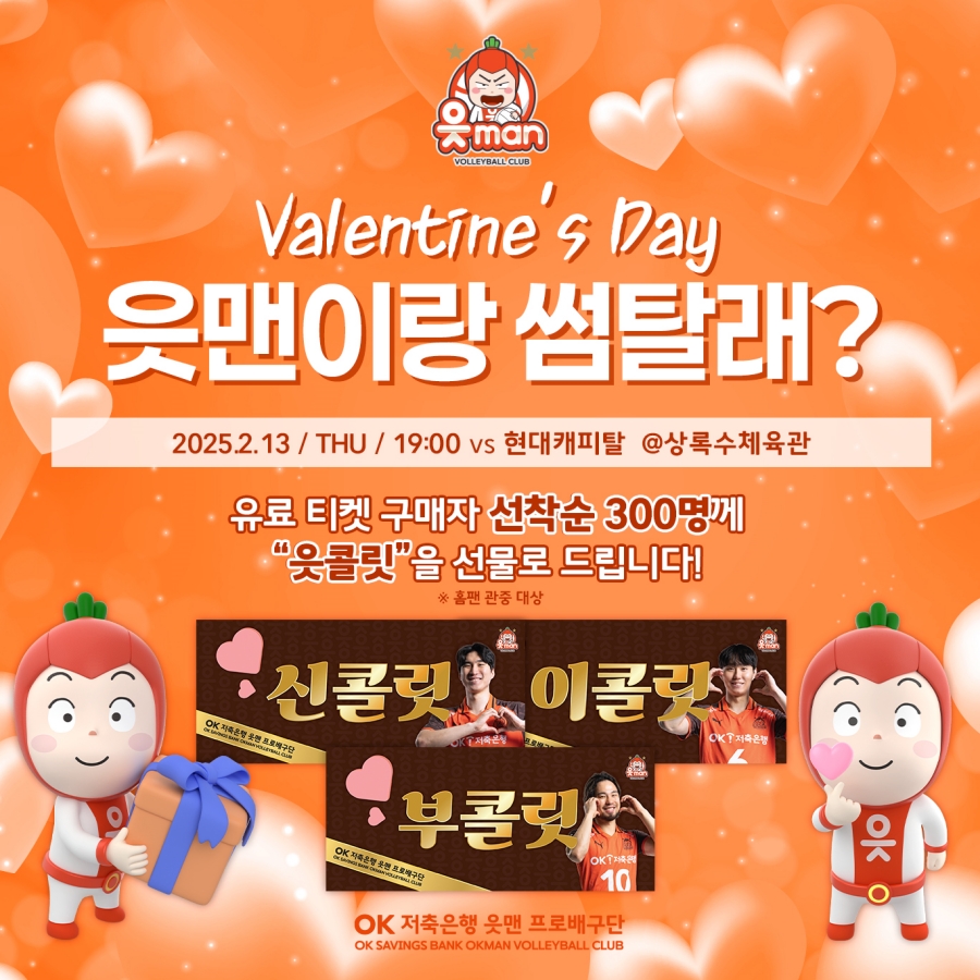 우선 13일 상록수체육관을 찾는 유료 관중 선착순 300명에게는 발렌타인데이를 앞두고 팬들에게 특별한 초콜릿을 선물한다. 선수들의 사진이 들어간 '읏콜릿'으로, 이민규·신호진·부용찬 버전의 초콜릿이 팬들을 찾아간다.