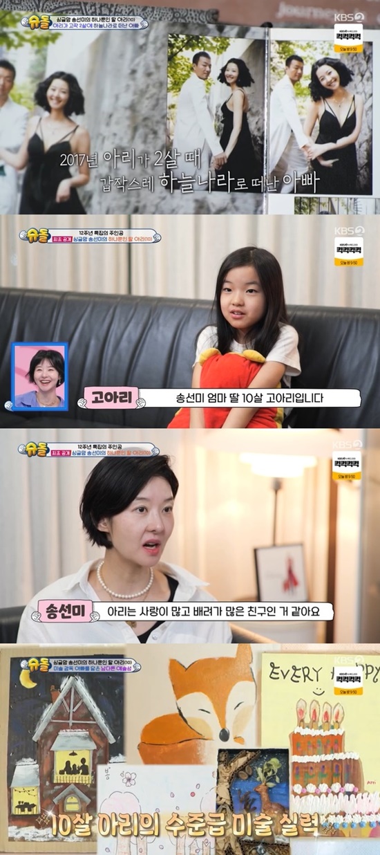 송선미는 "아리가 2살일 때 아빠가 세상을 떠난 것이다. 남편은 굉장히 관대하고 따뜻하고 매너 있고 배려 많았던 사람이었다. 아리에게 아빠한테 생겼었던 일들을 다 설명해줬었다"고 얘기했다.