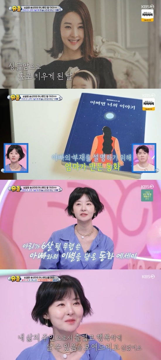 아리 양의 나이대에 맞게 아빠에 대한 이야기를 전해줬었다는 송선미는 딸에게 아빠의 부재를 설명하기 위해 만든 동화 에세이를 소개하며 "쓰다 보니 나의 얘기를 쓰게 되더라"고 울컥했다.