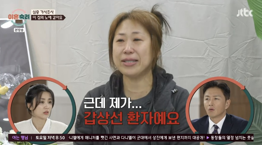 아내는 무직 상태인 남편에 대해 "자기 그만두면 더도 말고 덜도 말고 열흘 쉰다고 하더라. 그래놓고 주구장창 쉬는 거다"라며 "근데 제가 감상선 환자다. 17살에 제가 수술을 했다. 그런데도 안 도와준다"고 말해 안타까움을 안겼다. 서장훈은 "저럴거면 혼자 살지 왜"라며 황당해 했다.