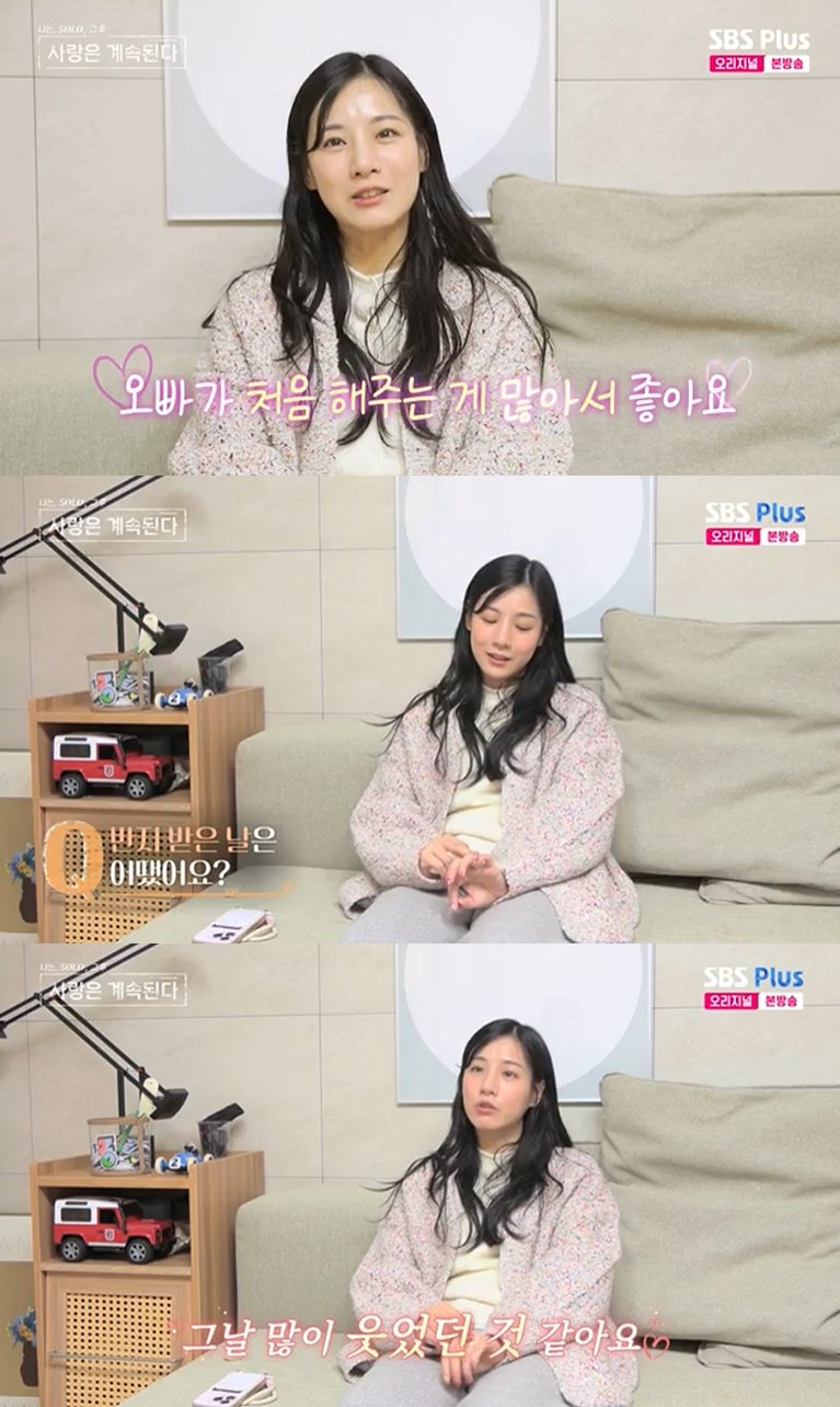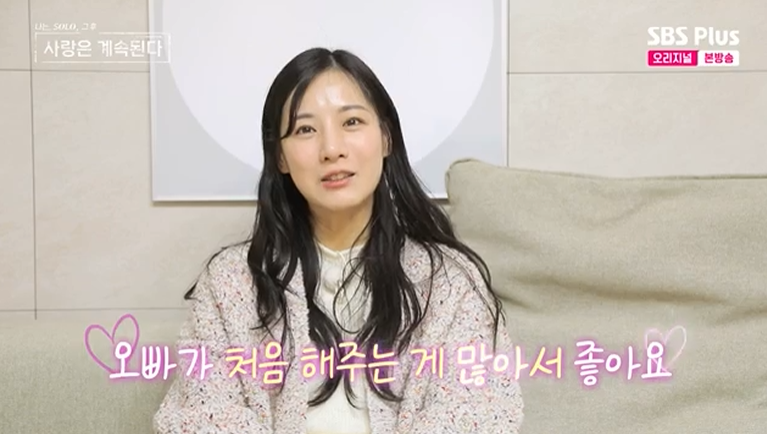 22기 옥순은 ‘서울-대전’을 오가며 장거리 연애 중인데, “오빠(22기 경수)와 해외여행도 처음 가봤고, 오빠가 처음 먹여주는 음식도 많았다”며 행복하게 웃었다. 그러면서 "좋다. 오빠가 이것저것 처음 해주는 게 많아서"라고 덧붙였다.