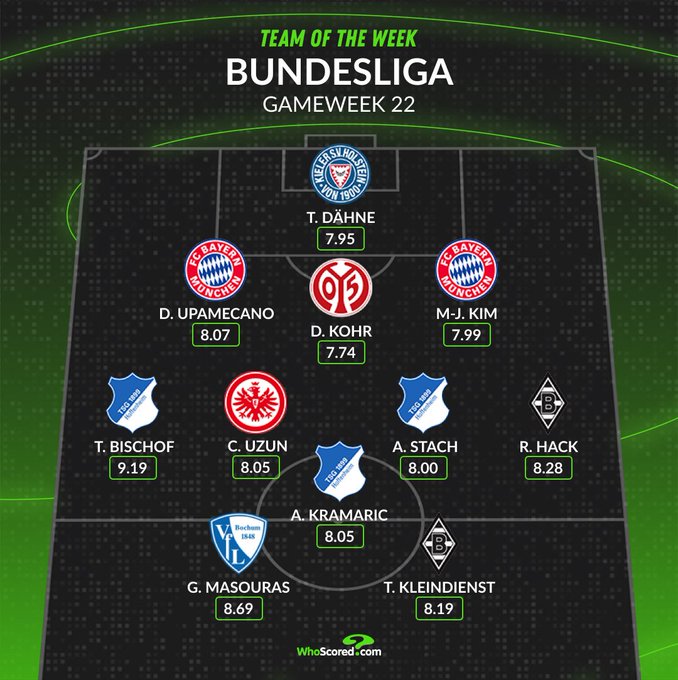 한편, 호펜하임이 베스트 일레븐에 가장 많은 선수를 배출했다. 호펜하임은 22라운드에서 베르더 브레멘을 상대로 3-1 승리를 챙겼다. 뮌헨 입장에서는 베스트 일레븐의 오른쪽 측면 미드필더로 뽑힌 톰 비쇼프 역시 다음 시즌 뮌헨으로 이적할 것이 이미 확정된 선수이기에 기쁠만한 기록이다. 비쇼프는 평점 9.19를 받으며 베스트 일레븐 중에서도 가장 높은 평점을 받았다.
