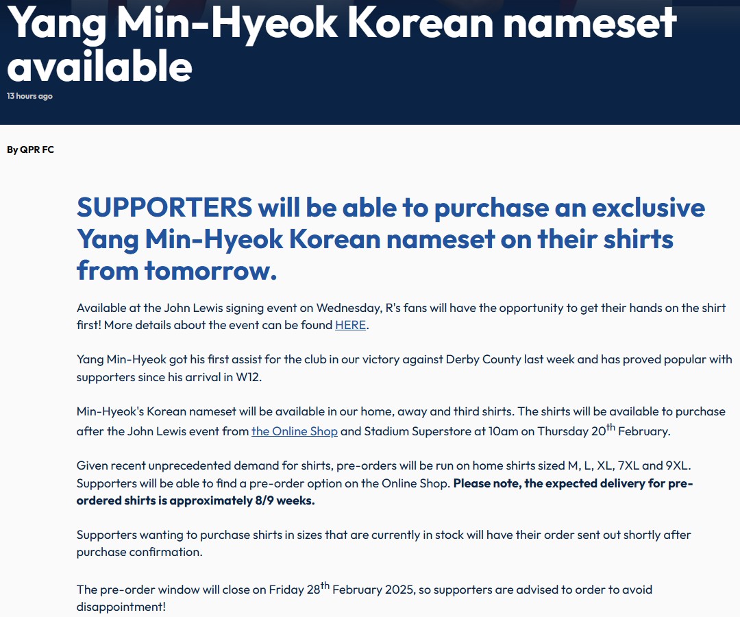 구단 공지에 따르면 양민혁 한글 유니폼 사전 주문 기간은 다가오는 2월 28일 금요일까지다. 선주문 매물 해외 배송은 8~9주 정도 소요될 것으로 예상했다. 유니폼을 받을 시점엔 양민혁이 QPR 임대 기간이 끝나가는 셈이다. QPR은 오는 5월 초에 챔피언십 최종전을 치르기 때문이다.