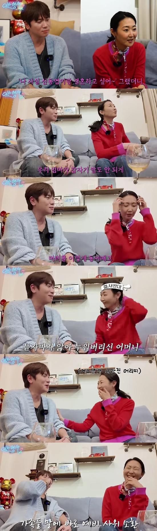 이날 선혜윤은 결혼 전, 어머니가 신동엽과의 결혼에 반대했던 일화를 공유했다. 그는 "처음에 우리 남편이랑 결혼하려고 부모님한테 말을 했다. 근데 우리 엄마가 갑자기 말도 안 되게 머리를 동여매고 앓아 누우셨다"고 당시를 회상했다.