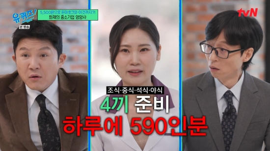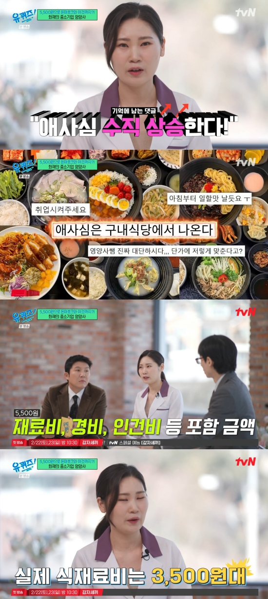 19일 방송된 tvN '유 퀴즈 온 더 블럭'(이하 '유퀴즈')에서는 '화제성 1등' 특집으로 꾸며진 가운데 중소기업 구내식당의 식단으로 화제를 모은 김보영 영양사가 게스트로 출연한 장면이 전파를 탔다.