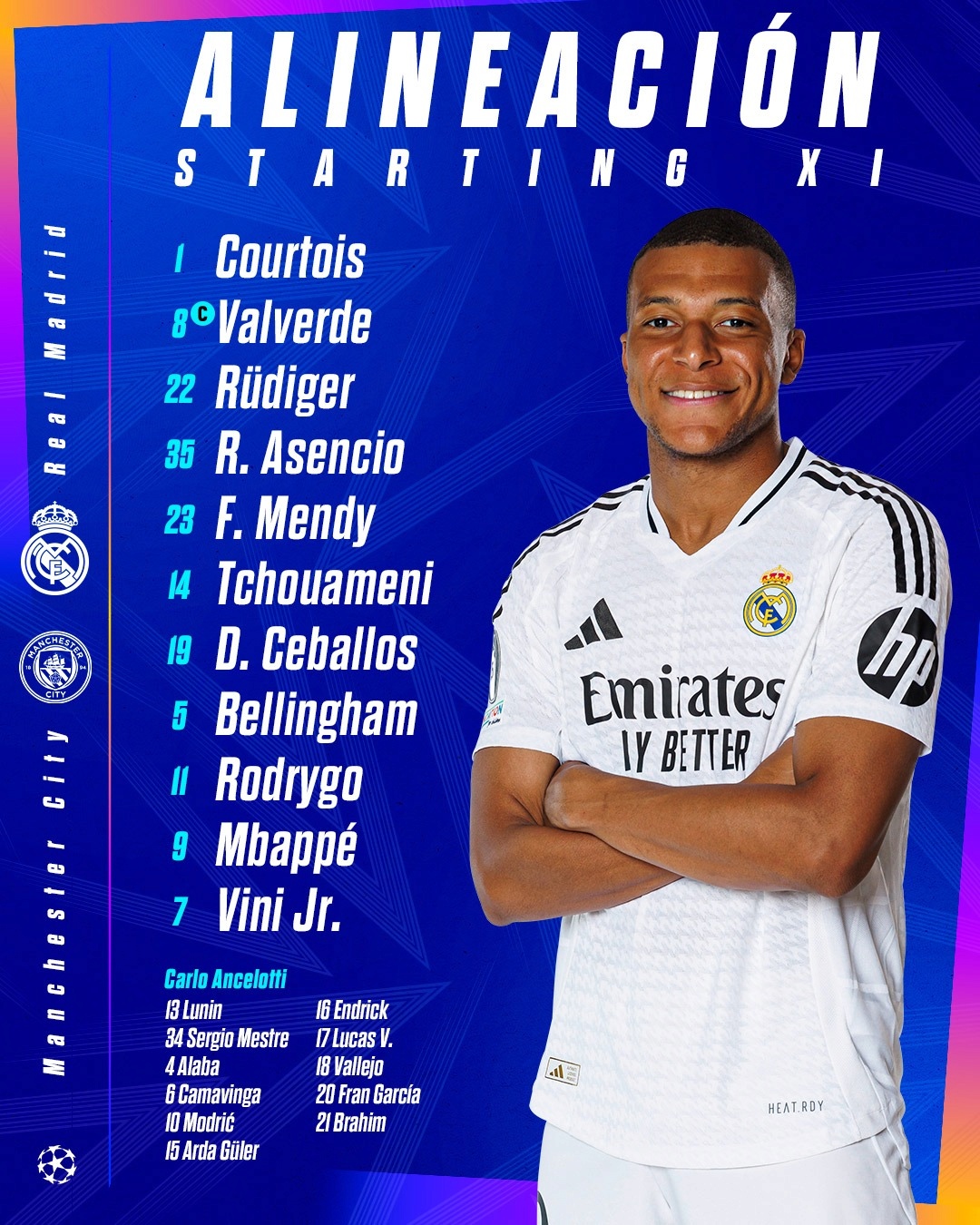 홈 팀 레알은 4-2-3-1 포메이션을 사용했다. 티보 쿠르투아가 골문을 지켰고, 페를랑 멘디, 안토니오 뤼디거, 라울 아센시오, 페데리코 발베르데가 수비라인을 구축했다. 허리는 다니 세바요스와 오렐리앵 추아메니가 맡았다. 2선에는 비니시우스 주니오르, 주드 벨링엄, 호드리구가 배치됐다. 킬리안 음바페가 최전방에서 상대 골문을 노렸다.