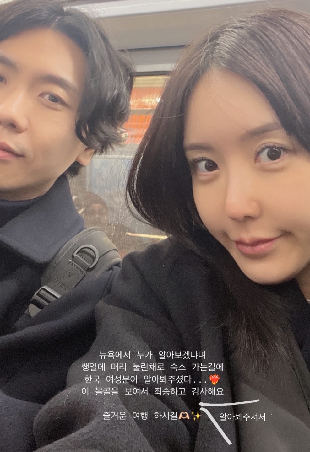 20일 이소라는 개인 계정에 "뉴욕에서 누가 알아보겠냐며 쌩얼에 머리 눌린 채로 숙소 가는 길에 한국 여성 분이 알아봐 주셨다. 이 몰골을 보여서 죄송하고 감사해요. 즐거운 여행하시길"이라며 연인 최동환과 미국 여행 중인 근황을 전했다.