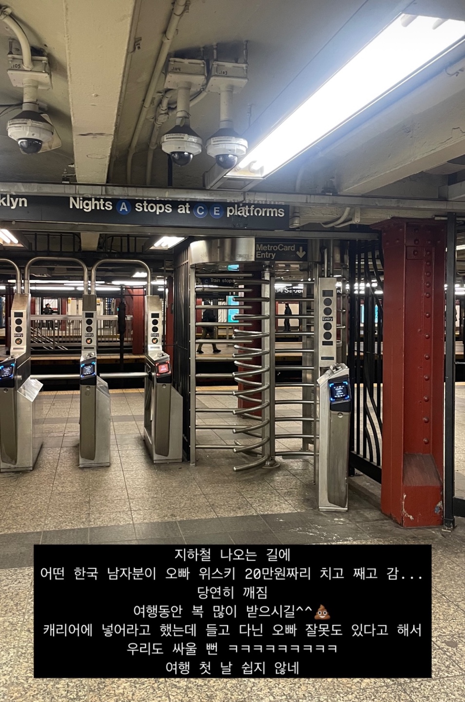 그는 "지하철 나오는 길에 어떤 한국 남자분이 오빠(최동환) 위스키 20만 원짜리 치고 째고 감. 당연히 깨짐. 여행 동안 복 많이 받으시길"이라며 "캐리어에 넣으라고 했는데 들고 다닌 오빠 잘못도 있다고 해서 우리도 싸울 뻔 ㅋㅋㅋ 여행 첫날 쉽지 않네"라고 해 안타까움을 안겼다.