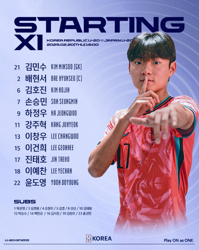 이창원 감독이 이끄는 대한민국 U-20 대표팀은 20일(한국시간) 중국 선전의 유소년 축구 트레이닝 베이스 1경기장에서 열린 일본 U-20 대표팀과의 2025 아시아축구연맹(AFC) U-20 아시안컵 조별리그 D조 3차전 전반전을 0-1로 마쳤다.