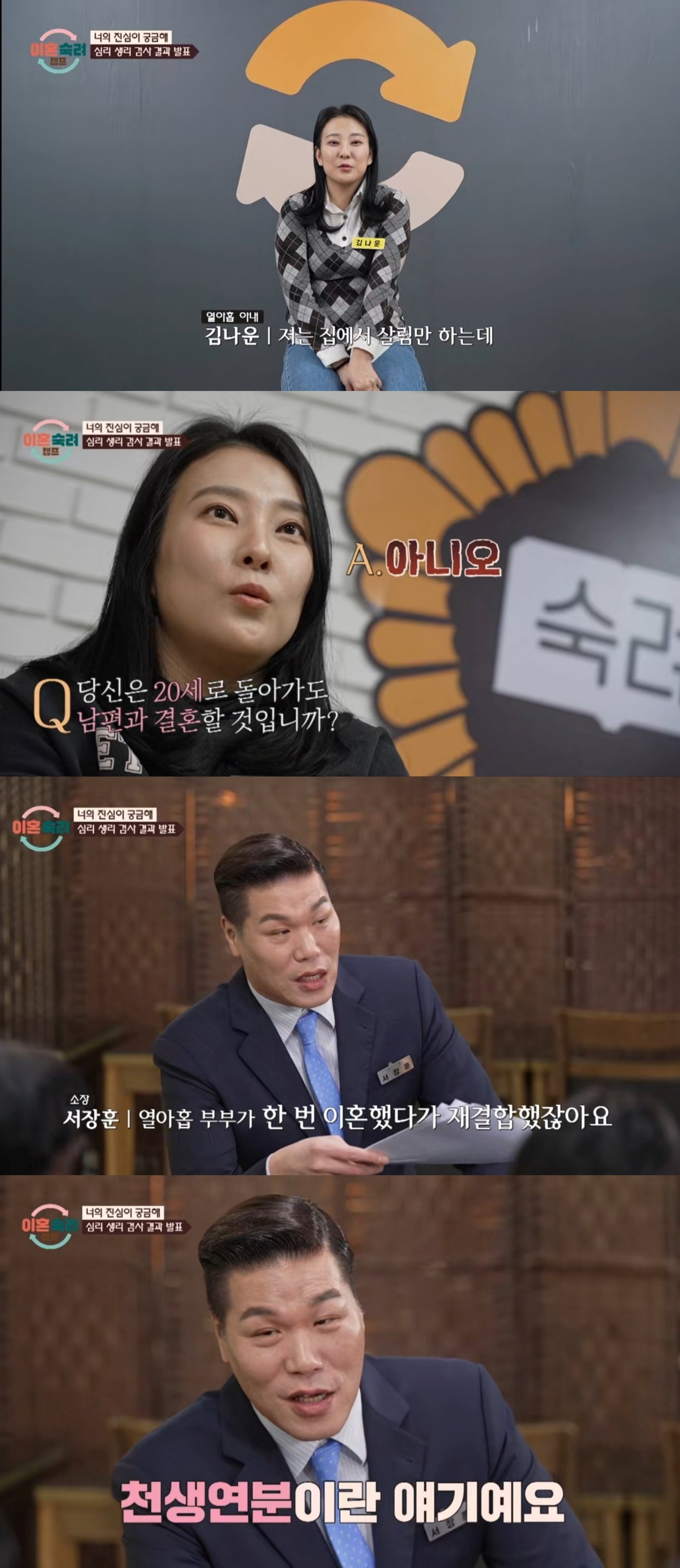 이어 남편은 아내에게 "다시 19살이 되더라도 남편과 결혼할거냐"는 질문을 던졌고, 아내는 "아니"라고 답했다. 남편은 그런 질문을 한 이유를 궁금해하는 서장훈에게 "그때의 아내가 좋아서"라고 애정을 표현했다.