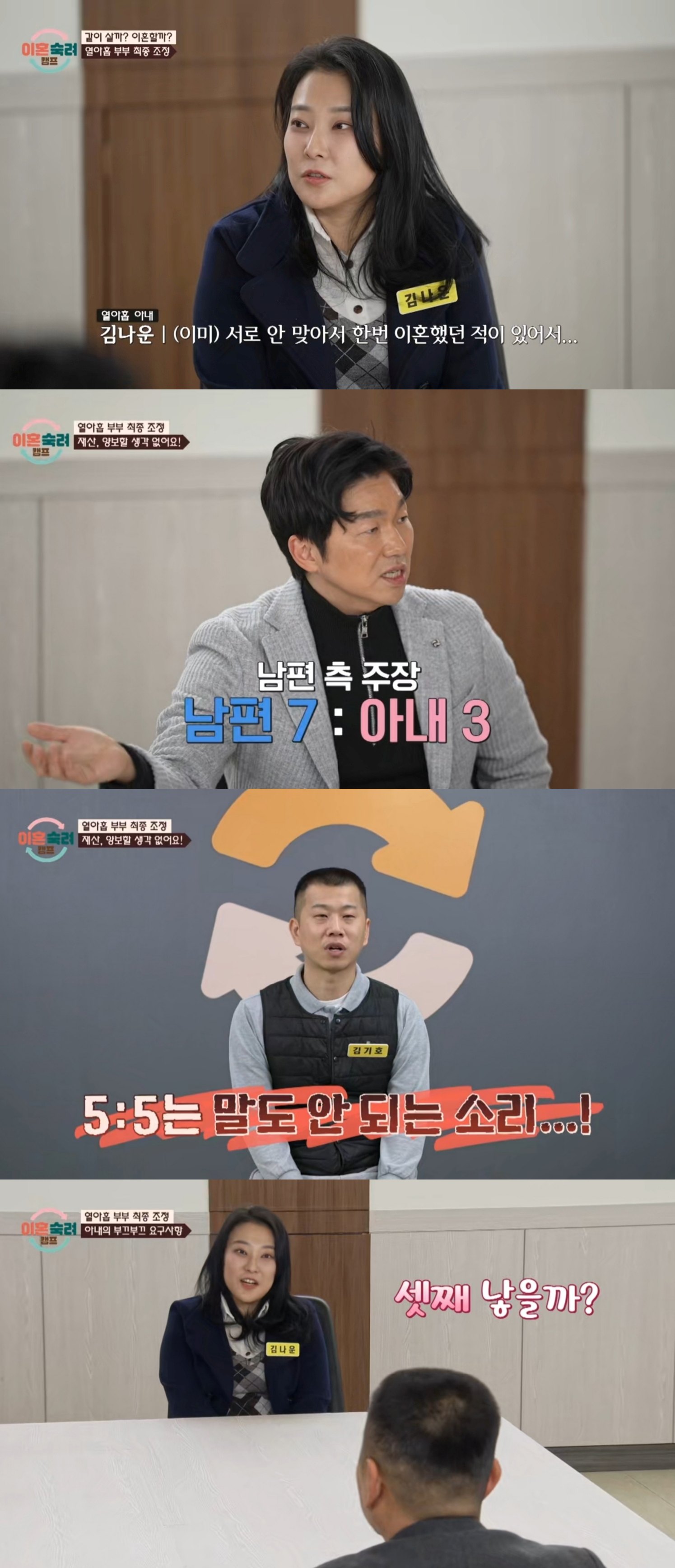 아내의 이혼 의사에 우선 재산 분할에 들어갔고, 아내 측은 5:5 분할을 요구했지만, 남편 측은 7:3을 제안했다. 이에 아내는 "좀 서운하고 화가 났다. 아들 둘을 낳고 살아 온 정이 있는데"라고 털어놨다. 남편은 재산을 모은 데 자신의 역할이 컸기 때문이라고.