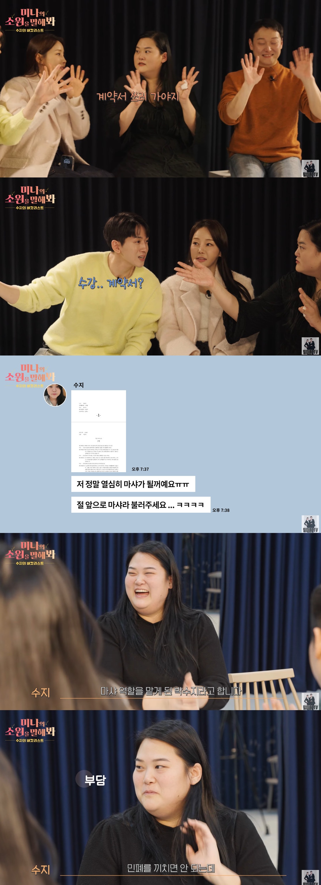 현재 93kg인 수지는 포기했던 꿈 '배우'에 다시 도전한다. 류필립, 미나와 연기 학원에 방문한 수지는 대본 리딩 후 "계약서 쓰러 가야지"라며 연기 수강에 야망을 드러냈다.