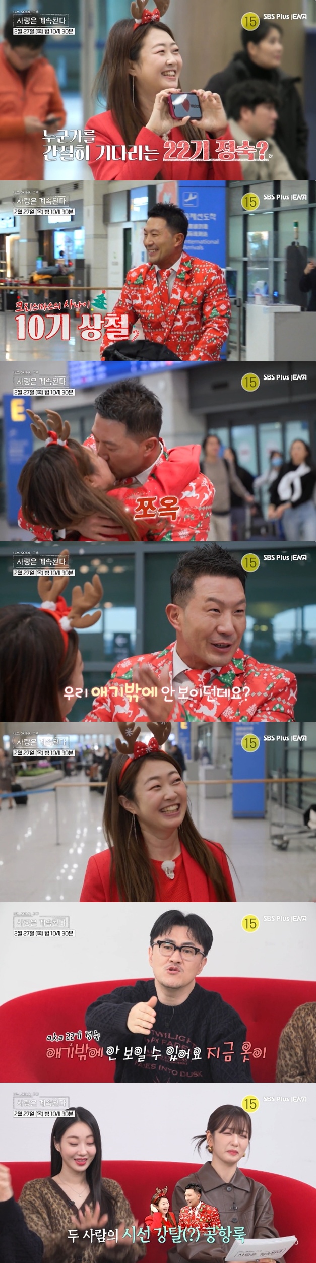 22기 정숙은 공항에서 10기 상철을 간절하게 기다렸다. 10기 상철이 입국장에 들어섰고 두 사람은 다정하게 포옹하고 뽀뽀했다.