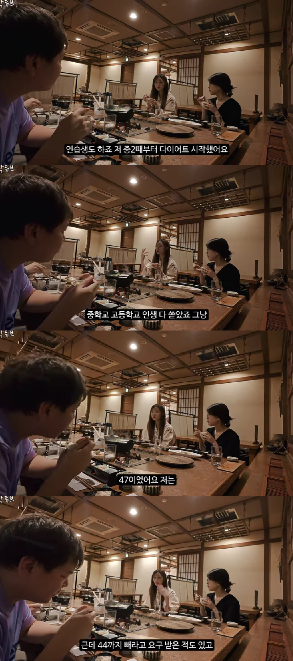 곽튜브는 "몇 kg 이하여야 되냐"고 물었고, 송민영은 "(유지해야 되는 몸무게가) 47kg였다. 근데 44kg까지 빼라고 요구 받은 적도 있다"고 말하며 그 시절의 혹독했던 다이어트를 전했다.