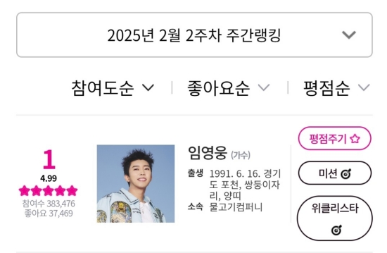 아이돌차트에 따르면 지난 2월 14일부터 2월 20일까지 집계된 2월 2주 차 평점랭킹에서 임영웅은 383,476표를 얻어 최다득표를 기록했다.