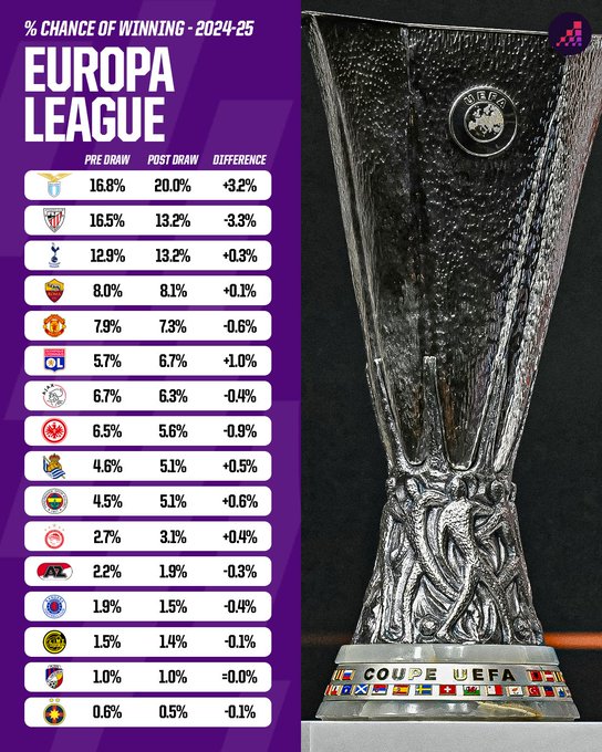 16강 대진 추첨 전에는 라치오가 16.8%로 1위, 아틀레틱 빌바오가 16.5%로 2위였다. 토트넘은 12.9%였다. 하지만 대진이 확정된 후 토트넘의 우승 확률이 증가하고 아틀레틱 빌바오의 우승 확률은 감소하면서 동률이 됐다. 라치오는 오히려 더 늘어나 20%를 찍었다.